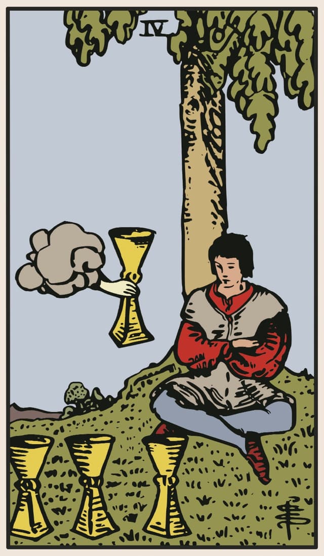 In the Rider-Waite deck, the Four of Cups card shows a man sitting beneath a tree with three cups in front of him. He seems deep in contemplation, ignoring a hand holding a fourth cup emerging from a cloud. This symbolizes the preoccupation with negativity and taking for granted the good things in life.